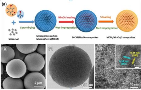 研究者采用液相浸渍法将具有电催化活性的Nb2O5纳米颗粒均匀负载到中孔炭微球骨架中,以此作为单质硫的载体,结合物理和化学吸附作用封装活性物质硫和中间聚硫化物,实现了硫正极性能的大幅提升。本工作利用电化学动力学研究证明,Nb2O5纳米晶体不仅与多硫化物阴离子之间存在强烈的化学吸附作用,而且可以作为电化学催化剂显著加快聚硫化物还原反应速率,减少多硫化物的“穿梭效应”。该硫正极表现出空前的倍率性能与优良的循环稳定性,在5C的电流下,放电容量达到887 mAh/g,循环500次后,容量维持在650mAh/g。该研究提供了一种电催化加快聚硫化物还原反应速率的新思路,为锂-硫电池正极材料的设计提出了理论指导。