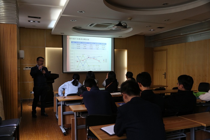 赵双良首先介绍了此次会议的目的和要求,之后通报了学院本学期的学籍处理情况。通过对比分析近两年来全校各专业的不及格率数据,以及学院各年级的学籍处理情况,他从员工工作的角度分析了学院学风建设目前取得的成绩和存在的不足,并结合自身的带班经验对班导师和辅导员的工作提出了建议。